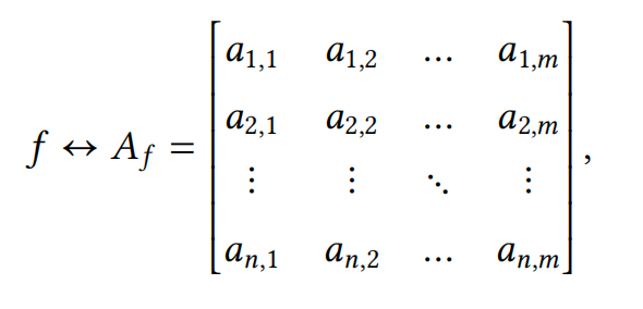 这些𝑛 × 𝑚 数完全描述了𝑓。为了符号简单,我们将它们存储在一个𝑛 × 𝑚 大小的表中,称为矩阵,我们将其表示为\(𝐴_𝑓\):