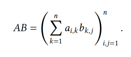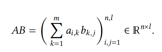 一般情况下,只有当相应的线性变换可以组合时,我们才能定义矩阵的乘积。也就是说,如果𝑓 ∶ 𝑈 → 𝑉,则𝑔 必须从𝑉开始。将其转化为矩阵的语言,𝐴 的列数必须与𝐵 的行数匹配。因此,对于任何\(𝐴 ∈ ℝ^{𝑛×𝑚}\) 和\(𝐵 ∈ ℝ^{𝑚×𝑙}\),它们的乘积定义为