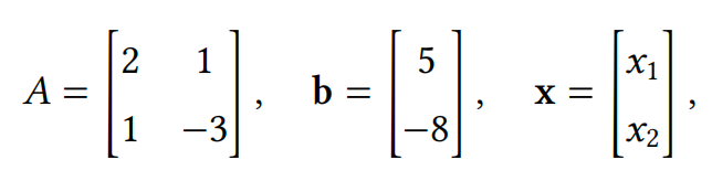 上述系统可以写成𝐴𝐱 = 𝐛的形式。这些被称为线性方程,用于建模从金融到生物学的各种过程。你会如何写出这样一个方程的解?如果存在一个矩阵\(𝐴^{-1}\),使得\(𝐴^{-1}𝐴\)是单位矩阵𝐼(由(4.4)式定义),那么将方程𝐴𝐱 = 𝐛从左乘以\(𝐴^{-1}\),将得到\(𝐱 = 𝐴^{-1}𝐛\)形式的解。