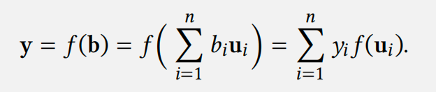 这证明了全射性。关于单射性,如果对于某个𝐚,𝐛∈𝑈,𝐲 = 𝑓 (𝐚) = 𝑓 (𝐛),那么,由于𝐚 和 𝐛 都可以写成\(𝐮_𝑖\)基向量的线性组合,因此我们有
