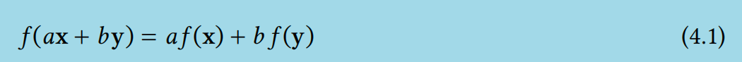 备注 4.1.1 线性本质上是将两个性质合二为一:对于所有向量 𝐱、𝐲 和所有标量 𝑎,𝑓 (𝐱 + 𝐲) = 𝑓 (𝐱) + 𝑓 (𝐲) 和 𝑓 (𝑎𝐱) = 𝑎𝑓 (𝐱)。由此可知 (4.1)可进一步写成