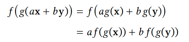 显示了任何线性 𝑓 和 𝑔 以及标量 𝑎 和 𝑏。