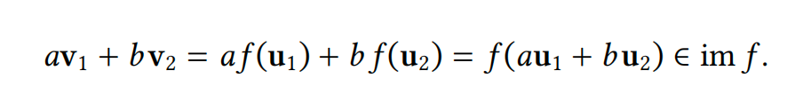 始终是𝐕的子空间(参见第 1.2.7 节)。这很容易验证:如果 \(𝐯_1, 𝐯_2 ∈ im 𝑓\),则存在 \(𝐮_1, 𝐮_2 ∈ 𝑈\),使得 \(𝑓 (𝐮_1) = 𝐯1\) 且 \(𝑓 (𝐮_2) = 𝐯_2\),如下式所示